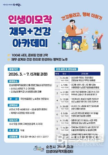 브릿지저널 김경미 기자 | 순천시는 중·장년층의 삶의 설계와 안정적인 노후 준비를 돕기 위해 ‘재무·건강 아카데미’ 수강생을 3월부터 7월까지 수시 모집한다고 밝혔다.