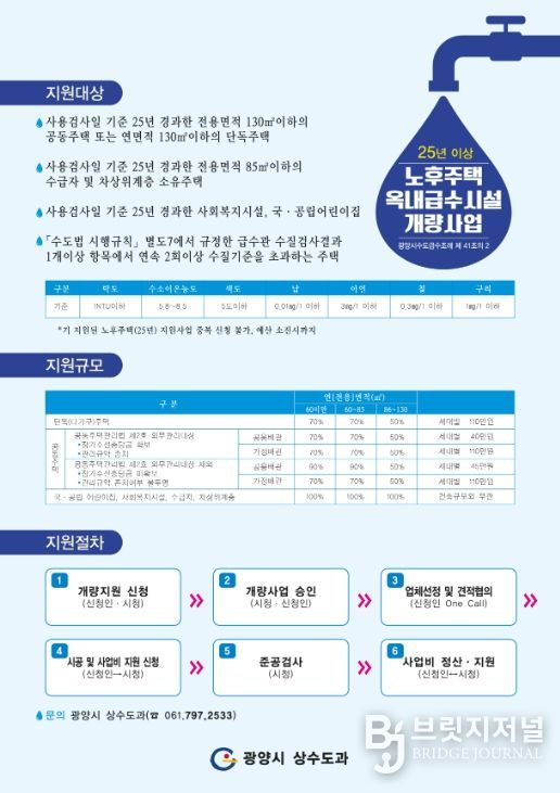 브릿지저널 김경미 기자 | 광양시는 옥내급수시설의 노후로 수도꼭지 녹물 발생 등 불편을 겪는 시민의 생활환경을 개선하기 위해 2019년부터 추진해 온 ‘노후 주택 옥내급수시설 개량사업’을 2026년 3월부터 시행한다고 밝혔다.