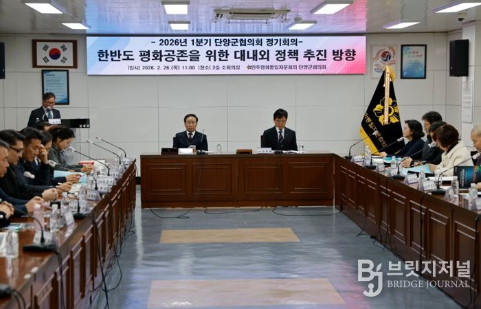 브릿지저널 김경미 기자 | 민주평화통일자문회의 단양군협의회는 26일 오전 11시 단양군청 소회의실에서 단양군수와 자문위원 등 25명이 참석한 가운데 '한반도 평화공존을 위한 대내외 정책 추진방향'을 주제로 2026년 1분기 정기회의를 개최했다.