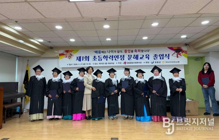 브릿지저널 김경미 기자 | 장흥군은 지난 27일 장흥종합사회복지관에서 ‘제1회 초등학력 인정 성인문해교육 졸업식’을 개최했다.