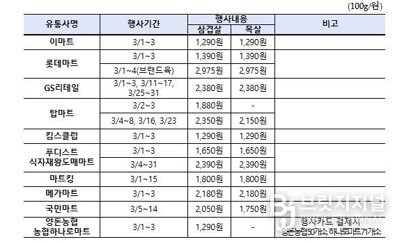 또한, 농협유통·하나로유통 판매장에서는 3월 3일까지 행사카드(NH, 국민, 삼성, 롯데, 우리, 전북은행, 카카오페이, 네이버페이, 토스, 페이코)로 결제 시 한돈 삼겹살(100g 기준)을 1,290원에 구매할 수 있다.