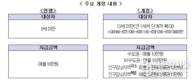 비수도권 및 인구감소지역에 거주하는 아동에게는 매월 2만 원 범위 내에서 아동수당을 추가로 지급하도록 했다. 개정법률안의 신속한 시행을 위해 추가 지급 대상 지역과 금액을 구체적으로 정한'아동수당법'시행령 개정안, ‘아동수당 추가지급 대상지역’ 고시 제정안도 입법(행정)예고(2.4.~2.27.)하여 국민의 의견을 수렴했다.