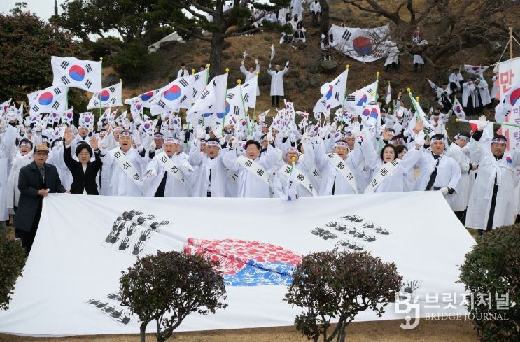 태극기를 높이 든 참석자들이 조천초등학교에서 조천만세동산까지 107년 전 뜨거웠던 항일정신을 기리며 약 1㎞ 구간을 행진한 가운데, 도내 러닝 크루 등 150여 명으로 구성된 ‘3·1 기념 만세 RUN’ 팀이 합류해 함덕해수욕장까지 코스를 함께 달렸다.