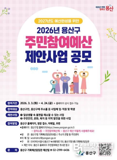 브릿지저널 김경미 기자 | 서울 용산구가 4월 24일까지 2027년 예산에 반영할 주민참여예산 사업을 공모한다. 생활안전, 문화, 복지 등 주민 생활과 밀접한 분야를 대상으로, 총규모는 10억 원이다.