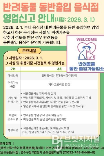 브릿지저널 김경미 기자 | 연수구는 3월부터 반려동물을 동반한 손님도 일반음식점, 휴게음식점, 제과점 등을 이용할 수 있다고 밝혔다.
