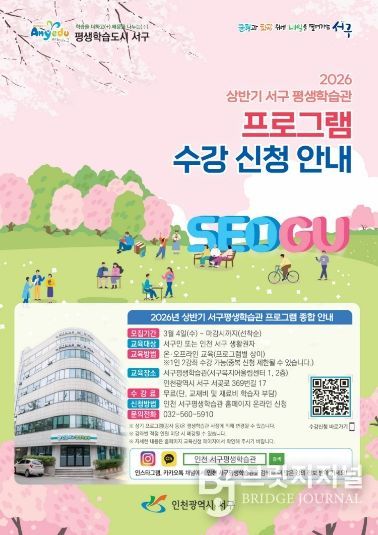 브릿지저널 김경미 기자 | 인천 서구는 오는 4일부터 ‘2026년 상반기 서구평생학습관 정기강좌’ 학습자를 모집한다고 밝혔다.
