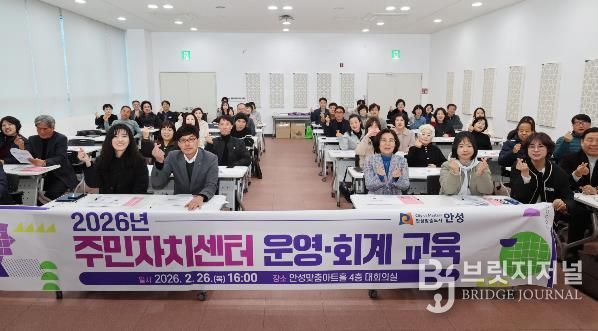 브릿지저널 김경미 기자 | 안성시는 2월 26일 오후 4시 안성맞춤아트홀 4층 대회의실에서 15개 읍·면·동 주민자치 위원(회)장, 간사, 업무 담당 공무원 등 45명을 대상으로 ‘2026년 주민자치센터 운영·회계 교육’을 실시했다.
