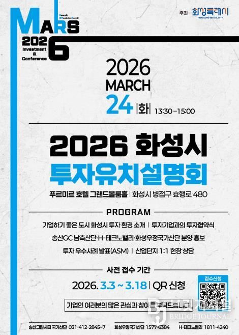 브릿지저널 김경미 기자 | 화성특례시가 오는 3월 24일 푸르미르 호텔에서 ‘2026 화성특례시 투자유치 설명회’를 개최하고, 3월 3일부터 3월 18일까지 QR코드를 통한 사전접수를 진행한다.