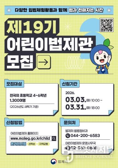 브릿지저널 김경미 기자 | 법제처는 3월 3일부터 31일까지 어린이법제관(4~6학년 초등학생 대상)과 청소년법제관(중ㆍ고등학생 및 학교 밖 청소년 대상)을 모집한다.