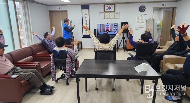 각 경로당에 모여 앉은 어르신들은 모니터 속 강사의 동작을 이리 저리 따라 하며 몸을 풀었다.