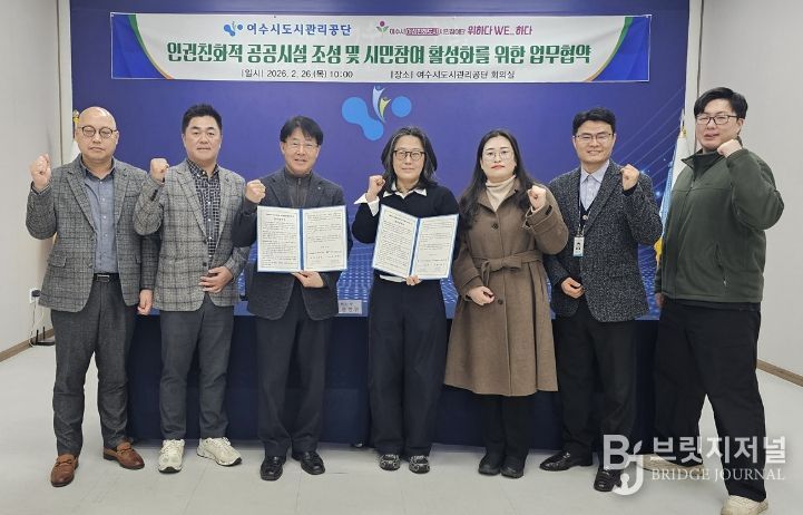 브릿지저널 김경미 기자 | 여수시는 지난 2월 26일 여수시 여성친화도시 시민참여단 ‘위하다WE_하다’와 여수시도시관리공단이 인권친화적 공공시설 조성과 시민참여 활성화를 위한 업무협약(MOU)을 체결했다고 밝혔다.