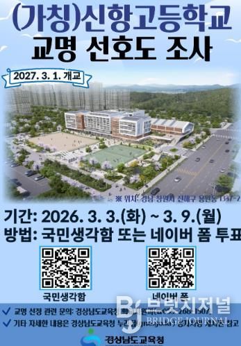 브릿지저널 김경미 기자 | 경상남도교육청은 2027년 3월 문을 여는 신설 학교 3곳의 이름을 정하기 위해 오는 3일부터 9일까지 도민 선호도 조사를 진행한다.