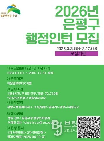 브릿지저널 김경미 기자 | 서울 은평구는 미취업 청년을 대상으로 행정인턴 참여자 12명을 오는 17일까지 모집한다고 밝혔다.