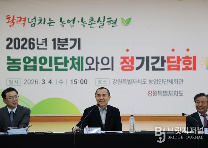 브릿지저널 윤나영 기자 | 강원특별자치도는 3월 4일 오후 3시, 도 농업인단체회관에서 농업인단체 회장 및 관계자들이 참석한 가운데 분기별 정기 소통 간담회인 ‘정담회’를 개최하고 2026년 농업인 지원 정책 방향을 공유했다.