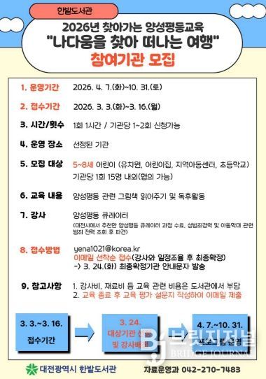 자세한 내용은 한밭도서관 누리집 공지 사항을 통해 확인할 수 있으며, 교육은 4월부터 10월까지 진행된다.
