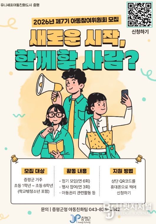 브릿지저널 김경미 기자 | 충북 증평군이 아동의 시선에서 지역 정책을 함께 만들어갈 ‘제7기 증평군 아동참여위원회’ 위원 35명을 오는 3월 31일까지 공개 모집한다.