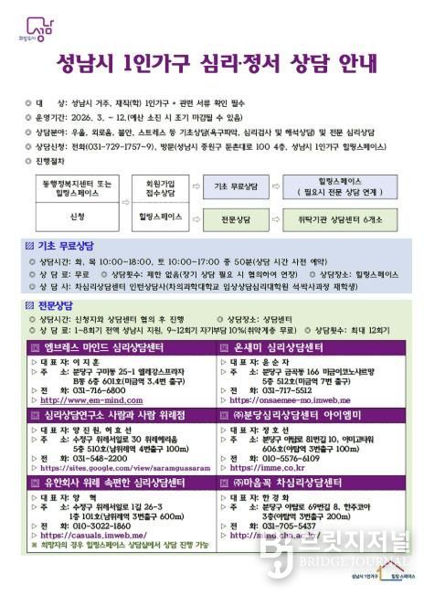 브릿지저널 김경미 기자 | 성남시는 우울감이나 외로움, 불안감, 스트레스로 어려움을 겪는 1인 가구에 전문적인 심리·정서 상담을 지원한다고 5일 밝혔다.