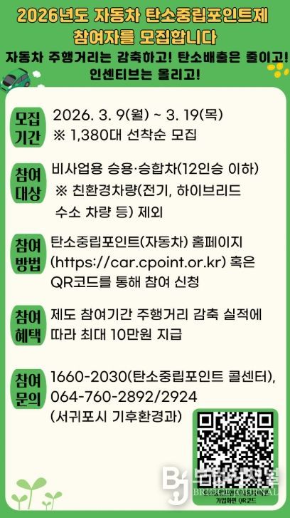 브릿지저널 정보영 기자 | 서귀포시는 3월 9일부터 3월 19일까지 수송부문 온실가스 감축 프로그램인 자동차 탄소중립포인트제 참여자 1,380명을 선착순 모집한다고 밝혔다.