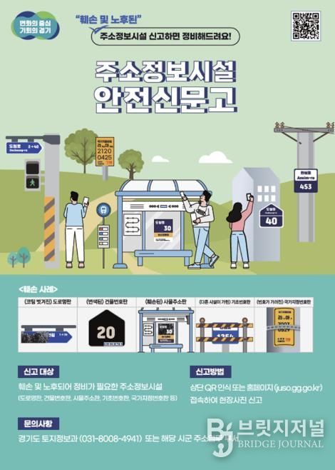 아울러 스마트 주소정보시설에 부착된 QR코드를 통해 산불방지, 찾아가는 정약용 도시대학 등 다양한 시책 및 홍보자료를 제공해 디지털 기반의 생활 밀착형 정보 서비스도 지속 확대한다. 주소정보시설이 훼손되거나 노후해 정비가 필요할 경우 ‘국민신문고’ 및 ‘경기도 주소정보시설 안전신문고’를 통해 신고할 수 있다.