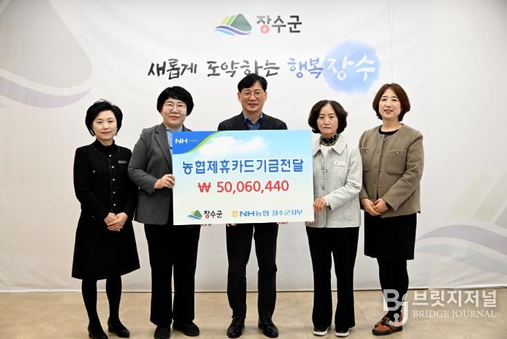 브릿지저널 윤나영 기자 | 장수군은 군 금고인 NH농협은행 장수군지부로부터 제휴카드 사용으로 조성된 적립기금 5,006만원을 전달받아 지역 환원 재원으로 활용하기로 했다.