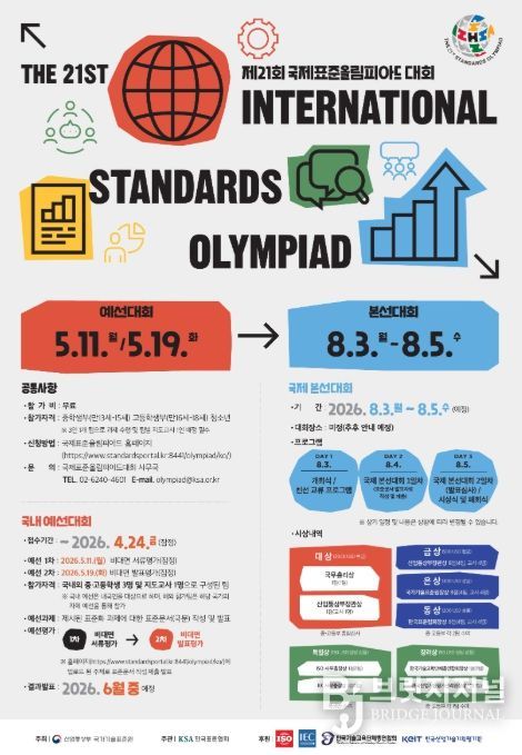 브릿지저널 김경미 기자 | 산업통상부 국가기술표준원은 금년 8월에 개최되는 세계 청소년 표준화 경진대회인 '제21회 국제표준올림피아드'에 참가할 한국대표팀 선발을 위해 3월 5일부터 국내 예선대회 참가팀 모집을 시작한다.