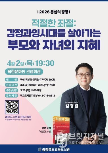 브릿지저널 김경미 기자 | 충청북도교육도서관(관장 노재경)이 주최하는 프리미엄 인문 강연 '통섭의 광장'이 오는 4월 2일 옥천문화원 관성회관에서 열린다.
