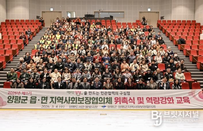 브릿지저널 김경미 기자 | 양평군은 지난 4일 양평도서관 물빛극장에서 250여 명이 참석한 가운데 ‘2026년 제11기 읍면 지역사회보장협의체 위촉식 및 역량 강화 교육’을 개최하고, 지역 맞춤형 복지안전망 강화를 위한 본격적인 활동에 들어갔다고 밝혔다.