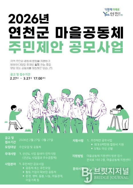 브릿지저널 김경미 기자 | 연천군이 주민 모임과 공동체를 대상으로 ‘2026년 연천군 마을공동체 주민제안 공모사업’ 참여단체를 모집한다.