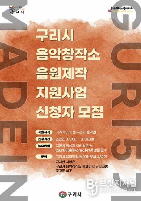 브릿지저널 김경미 기자 | 구리시는 3월부터 추진하는 구리시 음악창작소 지역 아마추어 음악가 음원 제작 지원사업 '2026 Made in Guri(메이드 인 구리)’참여자를 모집한다고 밝혔다.