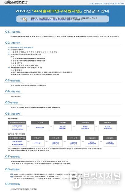 재단은 단순 재정 지원을 넘어 서울시 AI 정책과 연계한 프로그램을 운영하고, 연구성과 사사표기제 도입, 전문가 초청 강연, 박사후 연구원 워크숍 등 다양한 네트워킹 기회를 제공해 연구 역량 강화와 산·학·연 교류를 촉진할 예정이다.