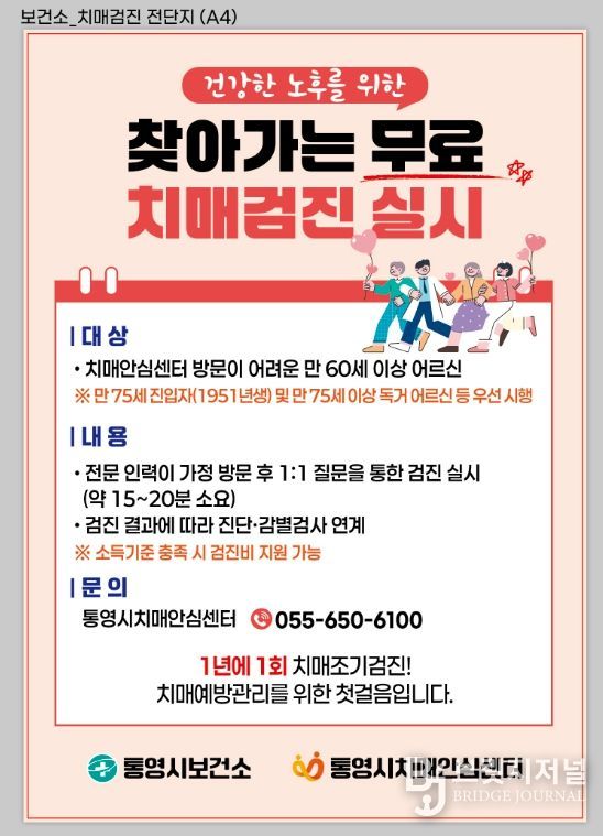 브릿지저널 김경미 기자 | 통영시는 올해 3월부터 9월까지 7개월간 치매로 진단받지 않은 만 60세 이상 지역주민 중 치매안심센터 방문이 어려운 주민을 대상으로‘찾아가는 치매조기검진’을 실시한다고 5일 밝혔다.