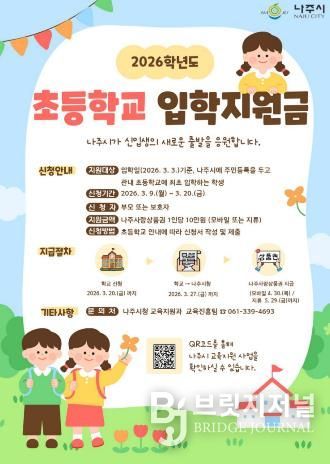 브릿지저널 김경미 기자 | 전남 나주시가 올해 초등학교에 입학하는 학생들의 새로운 출발을 응원하고 교육복지 실현을 위해 입학생 1인당 10만 원의 입학지원금을 지급한다.