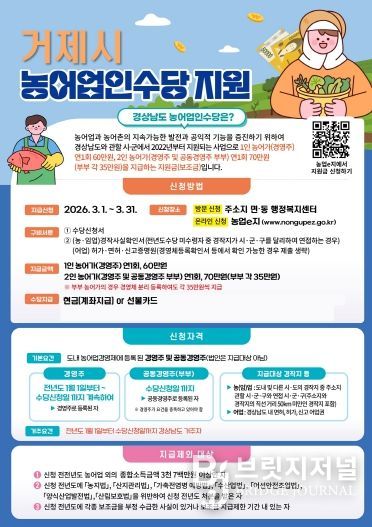 브릿지저널 김경미 기자 | 거제시는 농어업·농어촌의 공익적 기능을 유지·증진하고 농어업인의 소득 안정을 지원하기 위해 ‘2026년 농어업인수당’ 신청을 3월 1일부터 3월 31일까지 접수하고 있다.