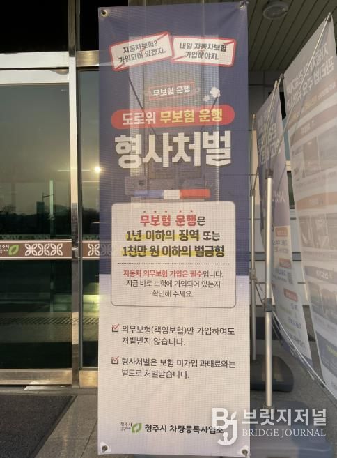이에 청주시 차량등록사업소는 ‘무보험 운행은 형사처벌 대상’이라는 내용의 홍보 배너를 설치하고, 의무보험 가입 안내문을 제작·배부하는 등 시민 홍보를 강화하며 무보험 운행 근절과 재발 방지에 힘쓰고 있다.