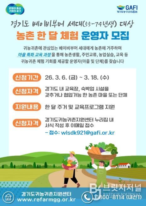 브릿지저널 김경미 기자 | 경기도와 경기도농수산진흥원은 ‘경기도 베이비부머 농촌 한 달 체험’을 운영할 마을·단체 2곳을 오는 18일까지 모집한다.