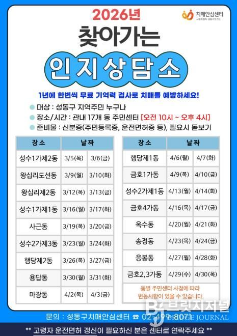 브릿지저널 김경미 기자 | 서울 성동구 치매안심센터는 3월 5일부터 4월 30일까지 17개 동 주민센터를 순회하며 치매 조기 검진을 실시하는 ‘2026 찾아가는 인지상담소’를 운영한다고 밝혔다.
