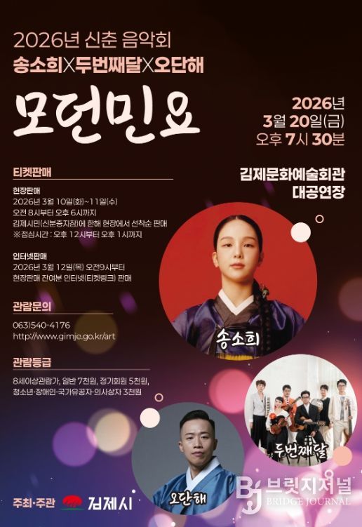 브릿지저널 윤나영 기자 | 전통국악, 민요, 판소리의 정서와 현대 음악의 감각을 융합한 '송소희X두번째달X오단해 모던민요'가 오는 20일 오후 7시 30분 김제문화예술회관 대공연장에서 펼쳐진다.