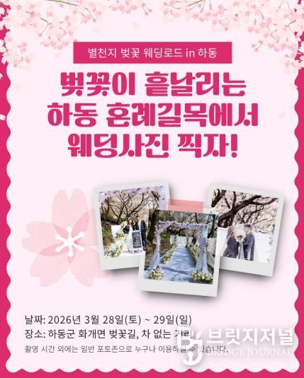 브릿지저널 김경미 기자 | 하동군은 오는 3월 27일부터 29일까지 열리는 ‘제27회 화개장터 벚꽃축제’를 앞두고, 특별한 웨딩 촬영 이벤트의 참가 신청을 받는다고 밝혔다.