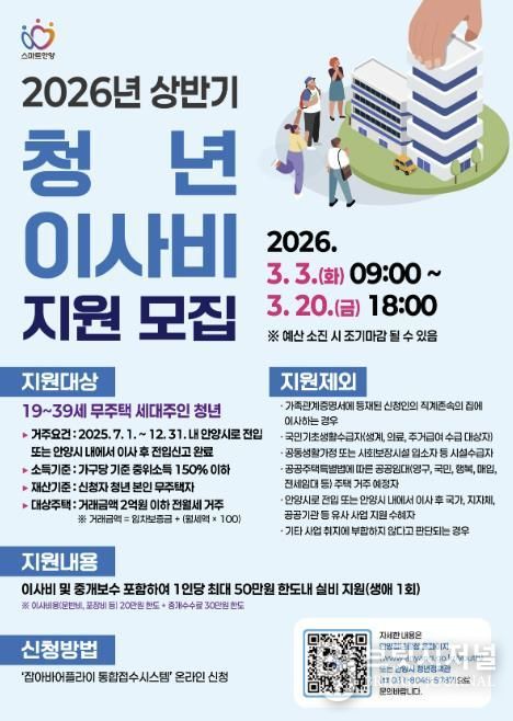 시는 2025년 7월 1일부터 12월 31일 내 안양시로 전입하거나 안양시 내에서 이사한 후 전입신고를 완료한 19세 이상 39세 이하의 청년 가구에게 1인당 최대 50만원 한도 내에서 이사비 및 중개보수비를 지원한다.