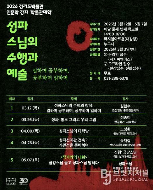 브릿지저널 김경미 기자 | 경기도박물관은 오는 3월 12일부터 ‘2026 경기도박물관 박물관대학(인문학 강좌)’을 운영한다. 경기도박물관 박물관대학(인문학 강좌)은 매년 역사·문화와 관련한 시의성 있는 주제를 선정해 도민에게 제공하는 교육프로그램이다.