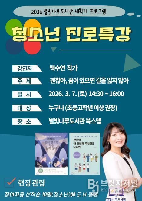 브릿지저널 윤나영 기자 | 2026년 새학기 독서문화진흥 프로그램 ‘백수연 작가의 진로 특강’이 3월 7일 토요일 별빛나루 도서관 계단형 열람석(북스텝)에서 현장 강연으로 진행된다.
