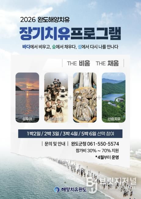 브릿지저널 김경미 기자 | 완도군에서는 4월부터 해양치유 활성화 및 효과 검증, 생활 인구를 확대하기 위해 ‘장기 체류형 해양치유 프로그램’을 운영한다.