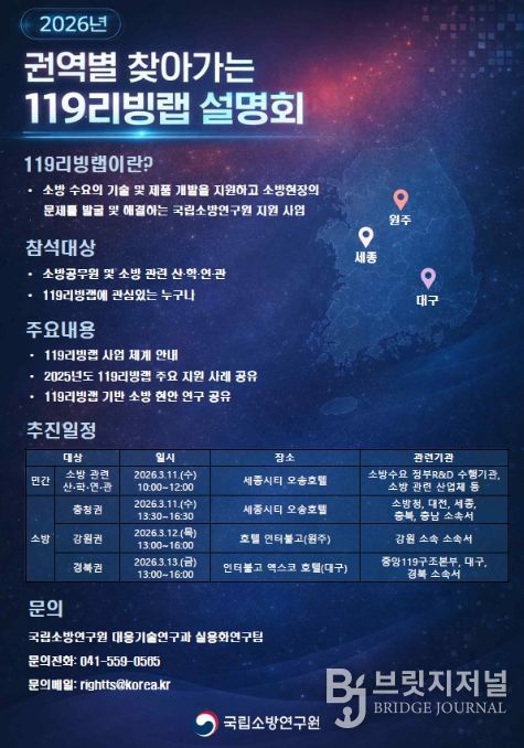브릿지저널 김경미 기자 | 소방청이 국립소방연구원이 소방 기술과 제품이 실제 재난 현장에 효과적으로 적용될 수 있도록 지원하는 ‘119리빙랩(Living Lab) 사업 설명회’를 3월 11일부터 13일까지 3일간 총 네 차례에 걸쳐 개최한다고 밝혔다.