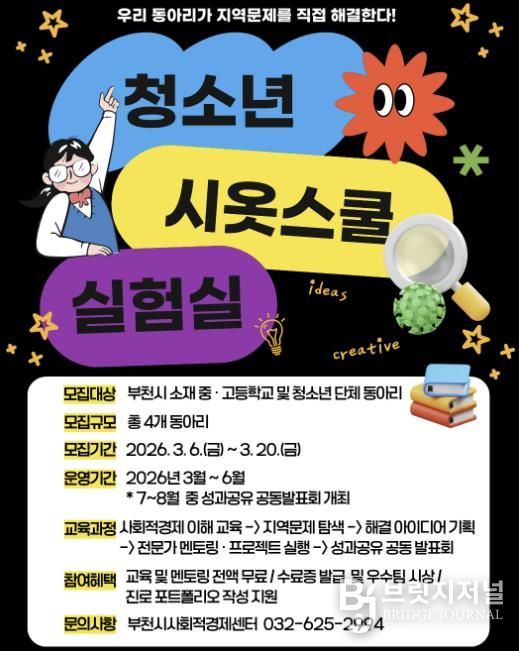 브릿지저널 김경미 기자 | 부천시는 3월 6일부터 20일까지 2026년 사회적경제 아카데미 ‘청소년 시옷스쿨 실험실’에 참여할 관내 중·고등학교와 청소년 단체 동아리를 모집한다.