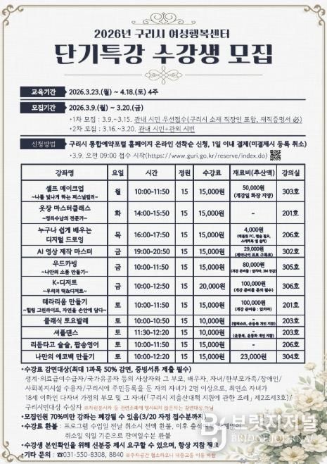 브릿지저널 김경미 기자 | 구리시 여성행복센터는 오는 3월 23일부터 4주간 2026년 단기 특강 교육프로그램을 운영한다.