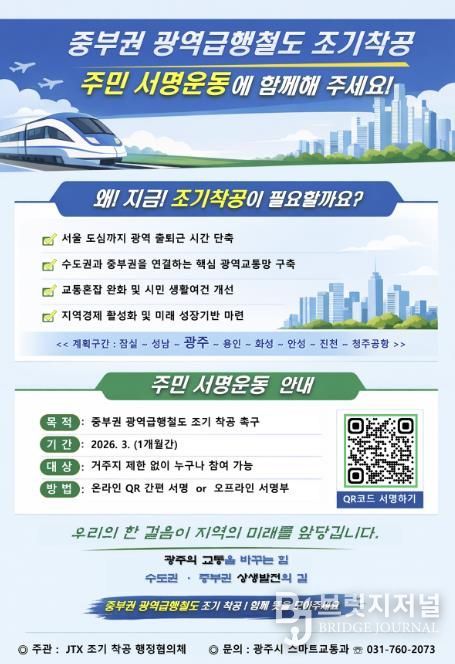 브릿지저널 김경미 기자 | 광주시는 중부권 광역급행철도의 조기 착공을 촉구하기 위해 3월 한 달간 주민 서명운동을 한다고 6일 밝혔다.