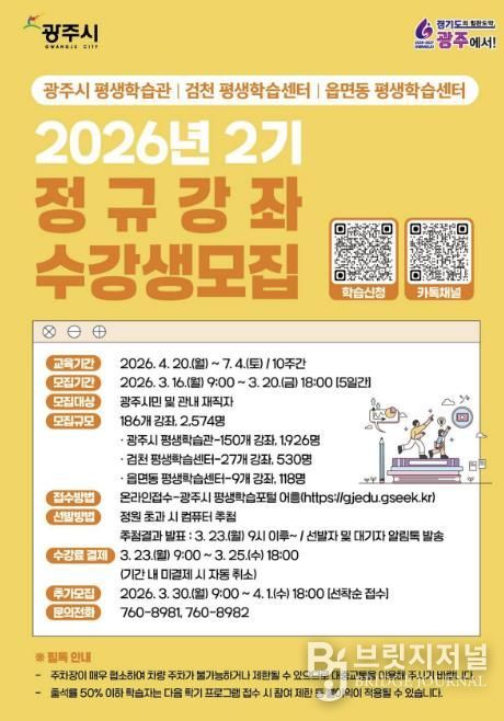 브릿지저널 김경미 기자 | 광주시는 오는 16일부터 20일까지 2026년 제2기 평생학습 프로그램 수강생을 모집한다고 6일 밝혔다.