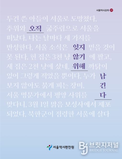 브릿지저널 김경미 기자 | 서울역사편찬원이 서울에서 살았던 개인이 남긴 기록을 통해 서울의 역사를 살펴보는 ‘서울역사강좌 제21권 《오직 잊지 않기 위해 남긴다》’를 발간했다. 시민들에게 서울의 역사를 쉽고 흥미롭게 알리는 ‘서울역사강좌’의 2026년 상반기 수업 내용을 책으로 엮은 것으로, 해당 강좌의 교재로도 활용된다.