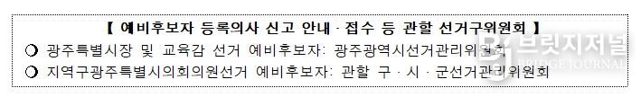 브릿지저널 김경미 기자 | 중앙선관위는 3월 5일 '전남광주통합특별시 설치를 위한 특별법'이 공포됨에 따라, 전남, 광주의 시·도지사(교육감 포함) 및 지역구시·도의회의원 선거의 예비후보자가 그 신분을 유지하려면 3월 16일까지 예비후보자 등록의사를 관할 선거구위원회에 서면으로 신고해야 한다고 밝혔다.
