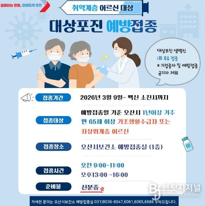 브릿지저널 김경미 기자 | 오산시보건소는 오는 3월 9일부터 백신 소진 시까지 관내 65세 이상 취약계층 어르신을 대상으로 대상포진 무료 예방접종을 시행한다고 밝혔다.
